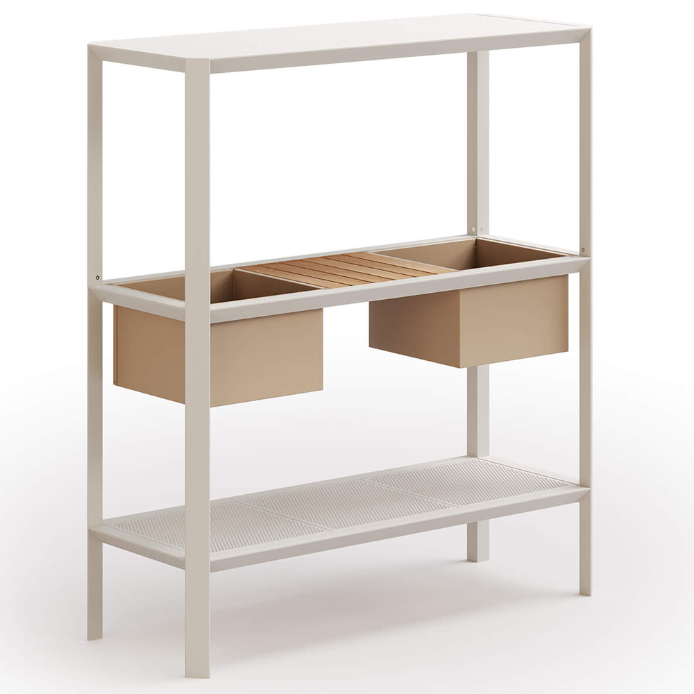 Destacando con una repisa central de teca y dos elegantes plantadores, este mueble no solo añade un toque de sofisticación a tu espacio, sino que también brinda soluciones de almacenamiento prácticas y elegantes.
