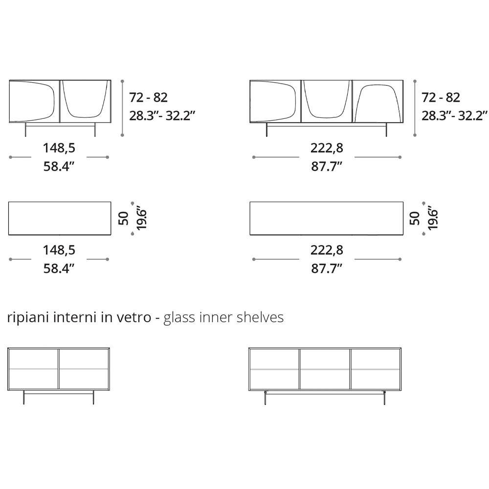 Elegante aparador lacado para comedor. El hermoso y contemporáneo modelo Trilogy de Ozzio Design tiene un acabado muy original. Uno de nuestro mejor vendidos, sus estantes interiores son de vidrio y las patas de metal pintado en grafito opaco.