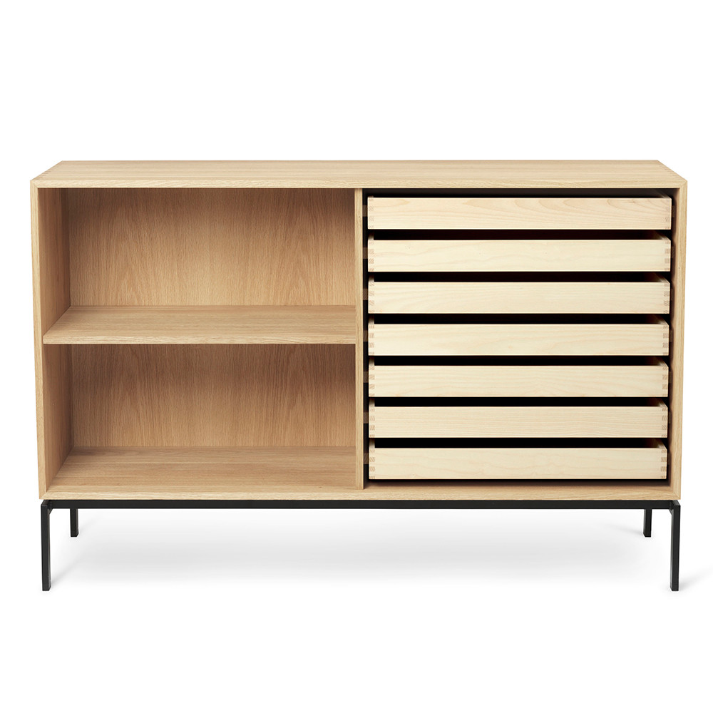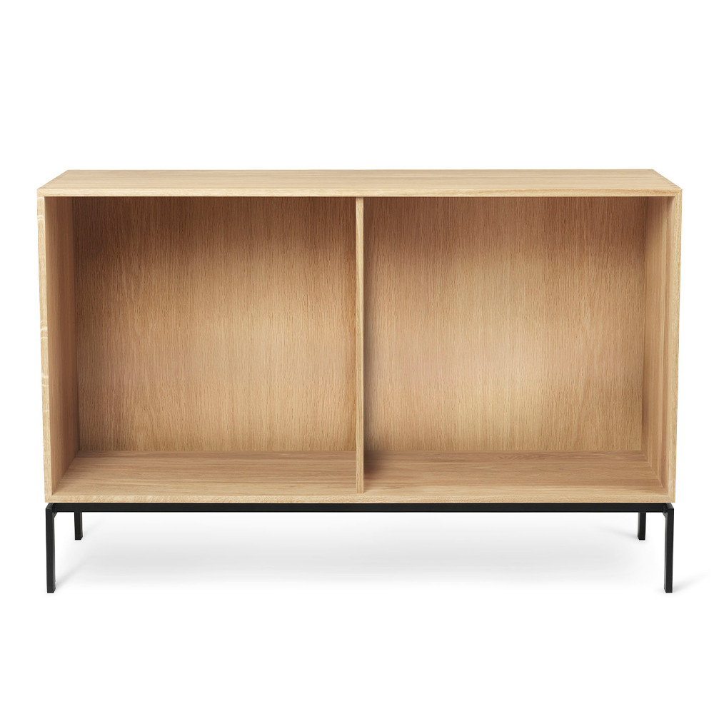 El sistema de librería FK63 encarna el enfoque inflexible de los diseñadores para el diseño, elaborado en roble macizo con certificación FSC (FSC-C135991), aceitado para acentuar la textura y el grano de la madera y con una estructura de acero pintado en negro.