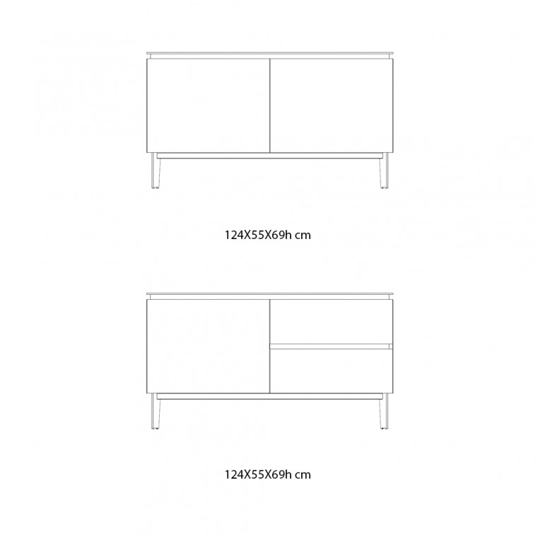 El aparador de diseño está disponible en versión con dos puertas batibles, y una puerta abatible y dos cajones.