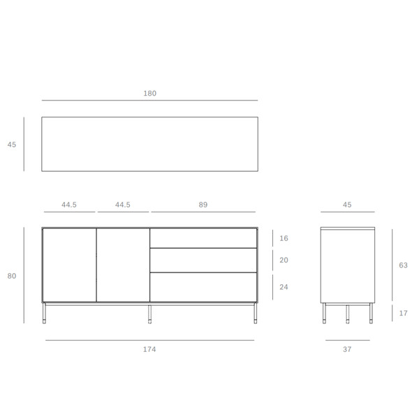 Las puertas, los cajones y su estructura están elaboradas en madera de roble macizo con acabado barnizado, y las patas están hecha en metal negro.