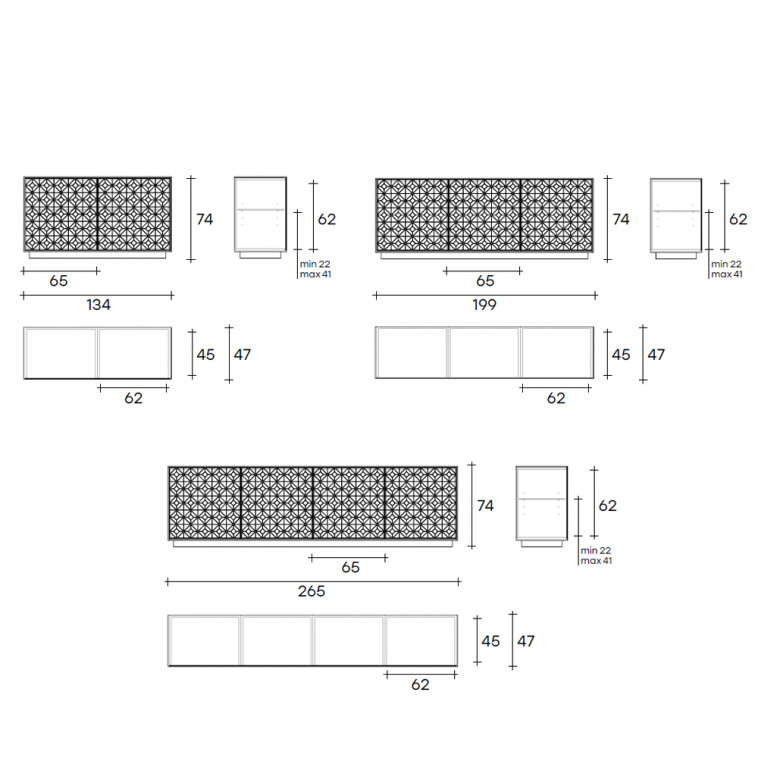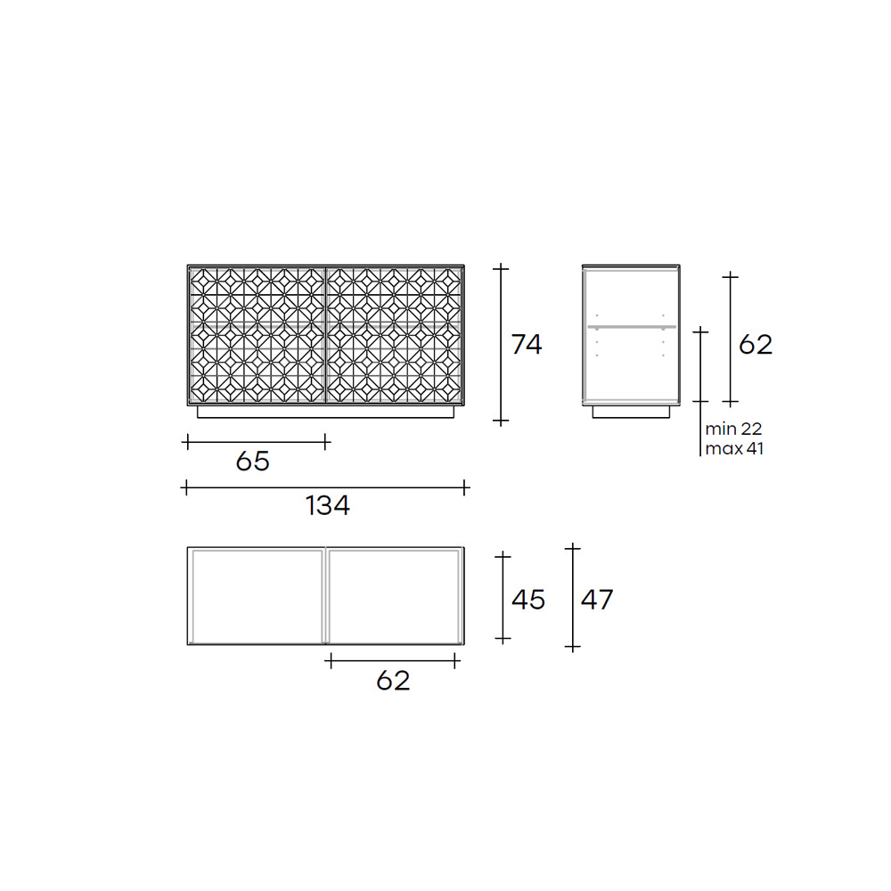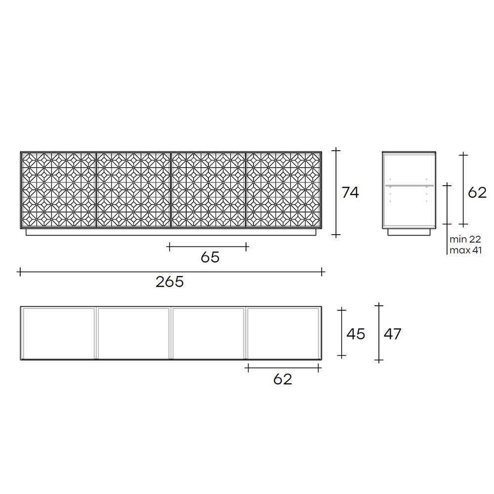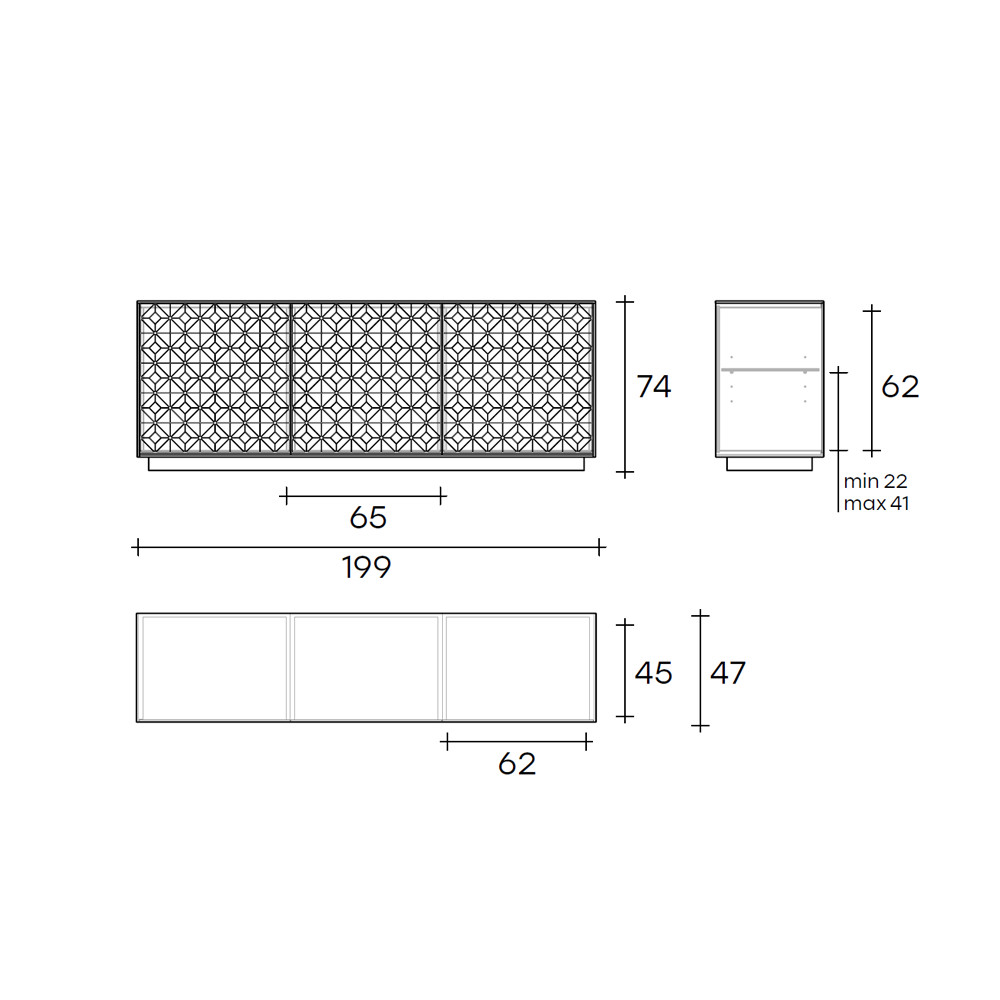 El aparador Echo de Fiam tiene una estructura hecha en madera lacada y puertas elaboradas en vidrio liso o fundido de 6 mm y estantes en vidrio templado de 8 mm en acabado ahumado.