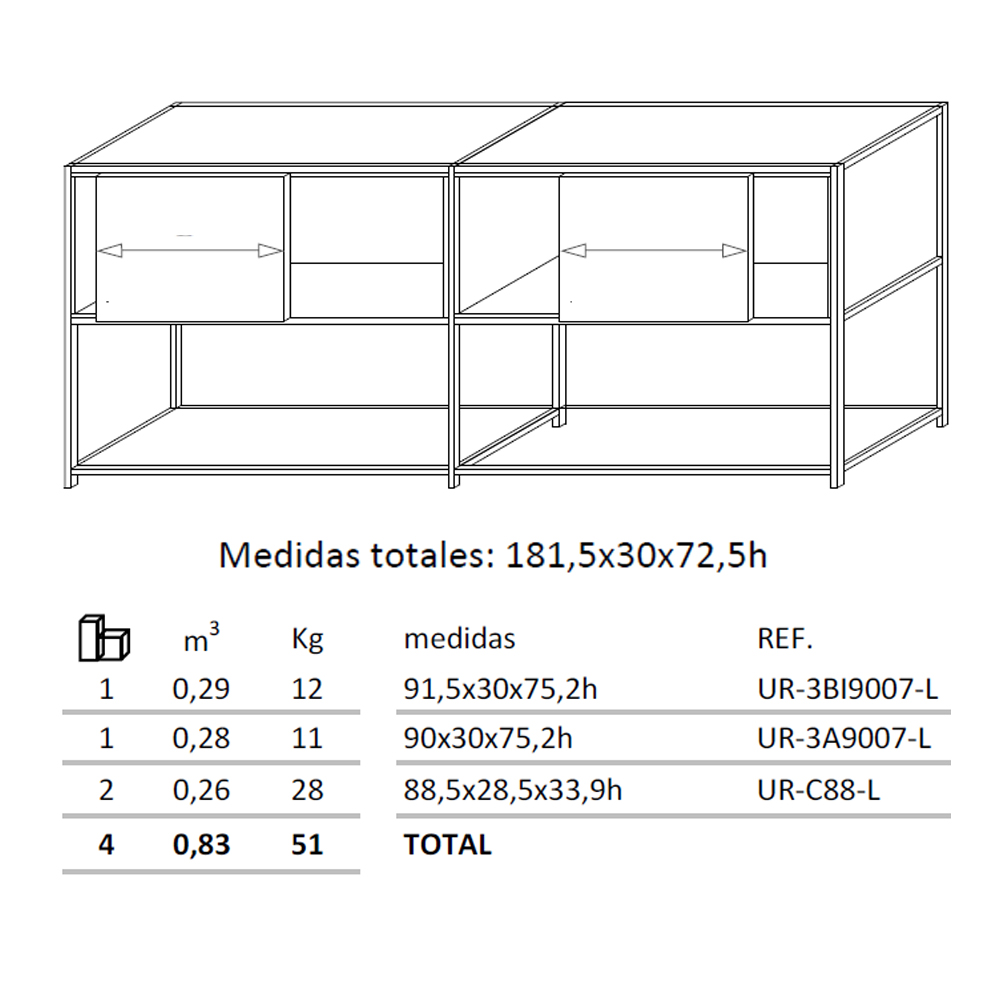 Aparador para salón con estructura metálica y módulos lacados. Dimensiones: 201,5x30x181,4h cm.