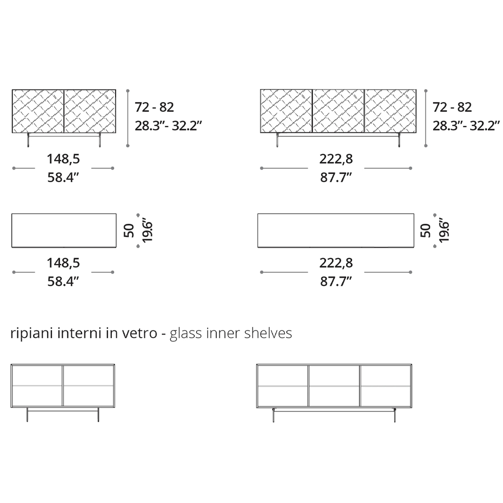 El aparador Sarah con la superficie de las puertas en espejo curvado evoca el encanto del suave movimiento de una superficie de agua en un continuo fluir de juegos de luz. Sarah es el aparador que llena el espacio con sugerentes geometrías, difuminadas y onduladas, ricas en infinitos reflejos. . Solo queda sumergirse en el espectáculo. Aparador en versión de 2 o 3 puertas con contenedor lacado, estantes internos de vidrio, revestimiento de puertas en espejo curvado, marco de aluminio pintado. Patas de vidrio o metal disponibles en dos alturas, 10 y 20 cm.