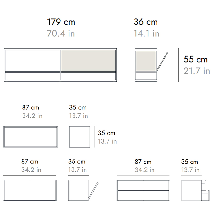 En esta versión, la OPEN, diseñada en el 2014, los volúmenes se vuelven transparentes y todavía más ligeros, a la vez que se pueden incorporar contenedores y abriéndose la posibilidad de generar divisiones de ambientes. Estantes fijos. Base con pies regulables.