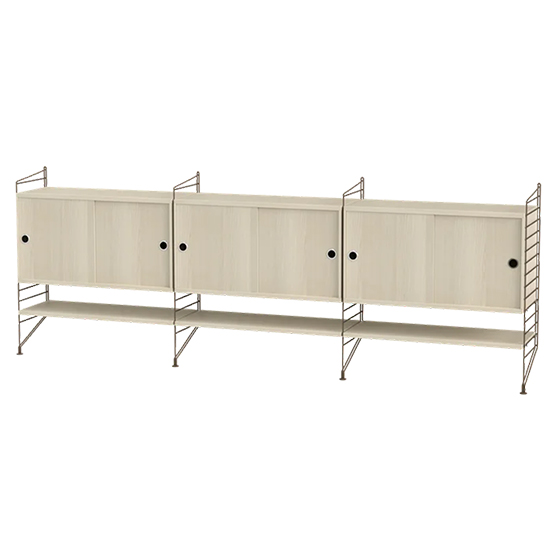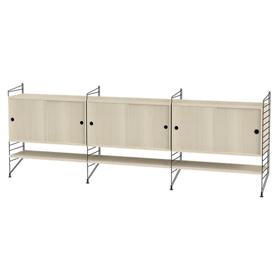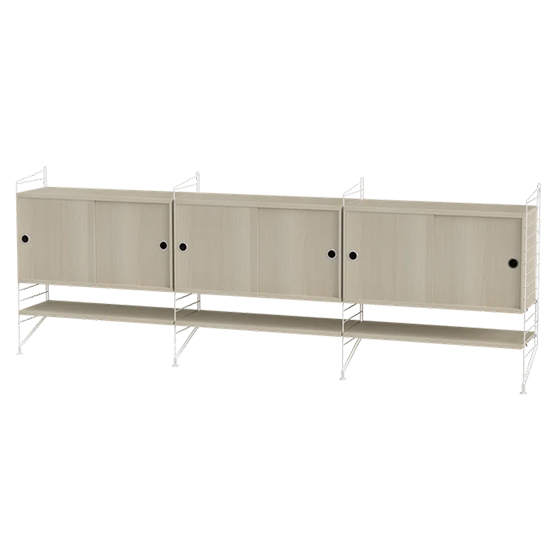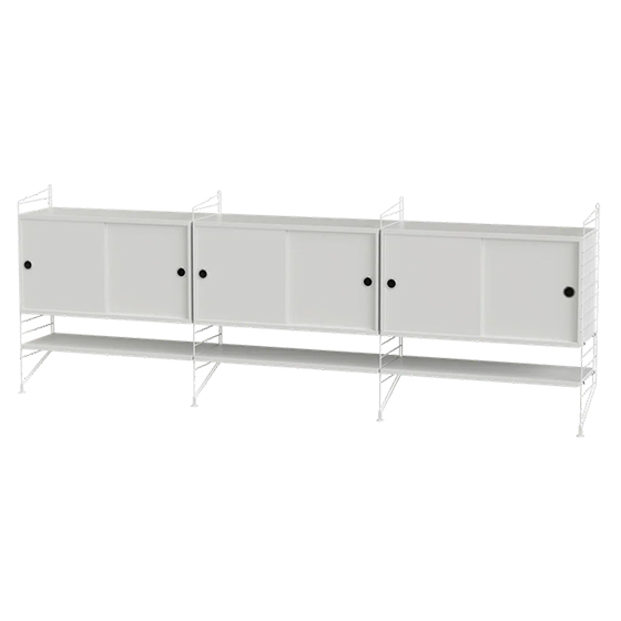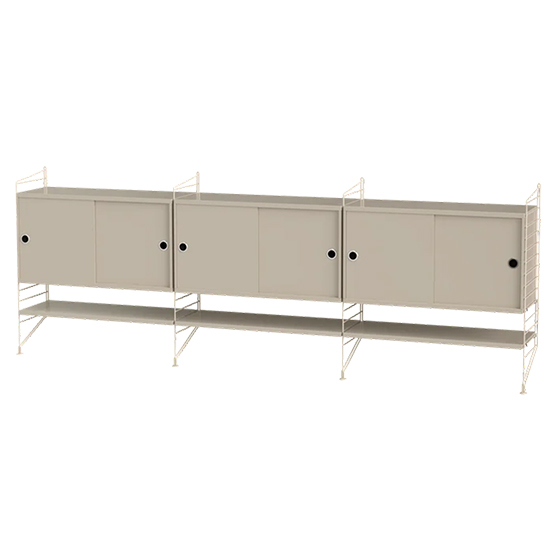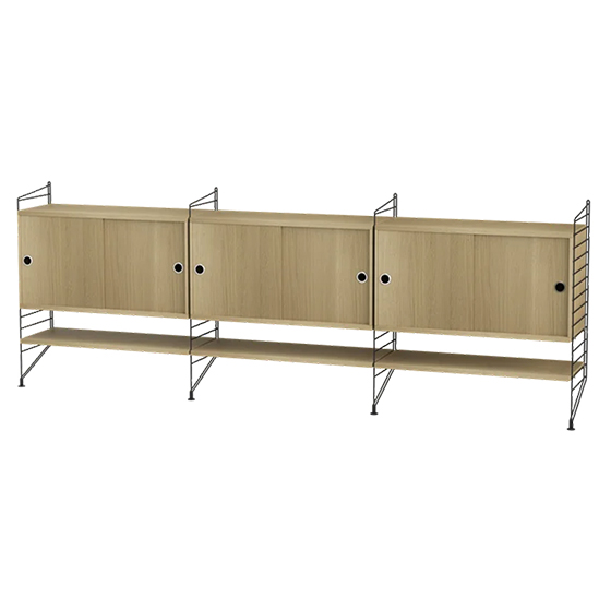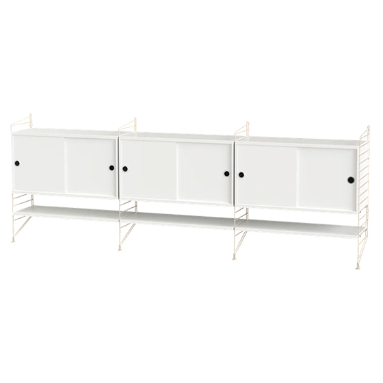Aparador modular de 85 cm de alto, diseñado para ofrecer almacenamiento y organización en salones de tamaño mediano a grande. Su montaje en pared aporta ligereza visual y permite destacar objetos sin ocupar espacio en el suelo.