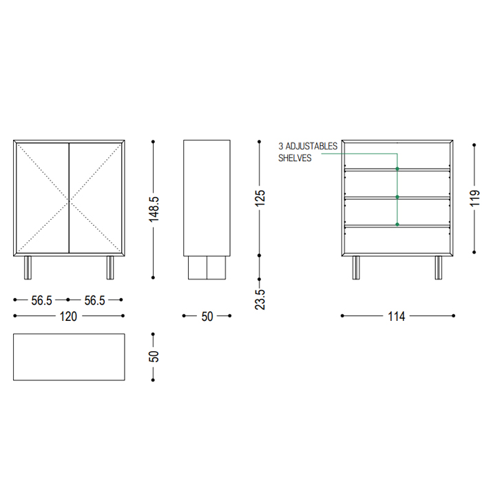 Aparador alto de madera maciza y contrachapado chapado, con marco de madera, puertas abatibles con mecanismo de apertura push-pull. La pieza se eleva del suelo gracias a dos patas de madera maciza pigmentadas en negro en forma de rombo.