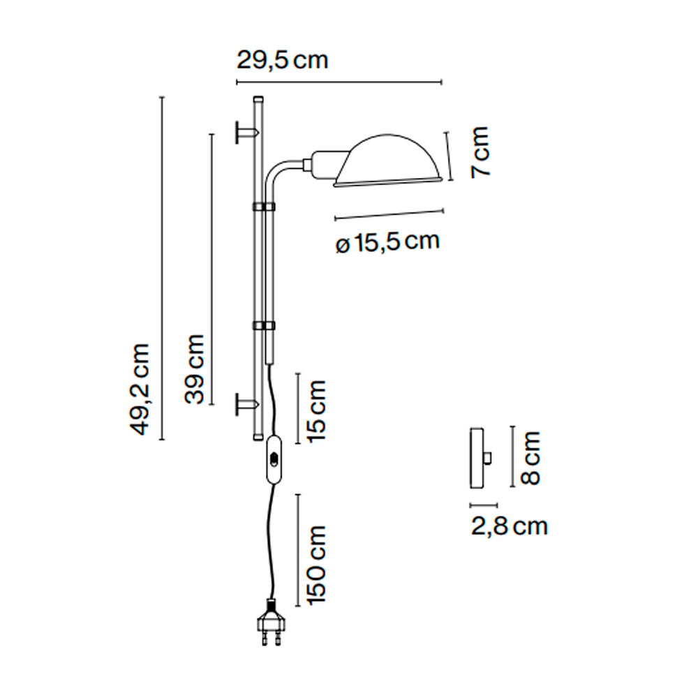 Aplique de pared con pantalla de aluminio y tija de acero. Dimensiones: 15,5x29,5x49,2h cm