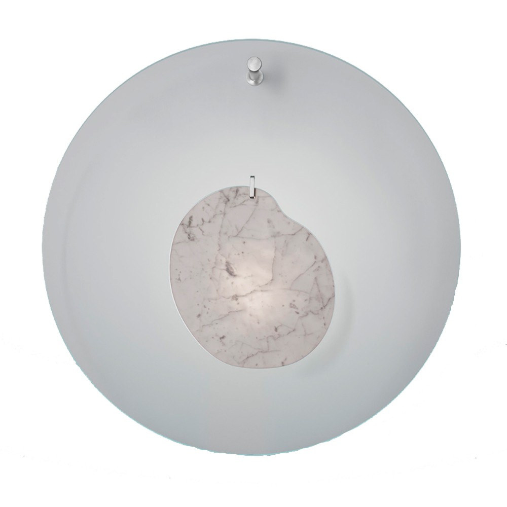 Aplique Gioia de Foscarini es una joya no solo pensada para iluminar sino para adornar el espacio doméstico. La magia de este diseño se encuentra en la composición, en un disco transparente se encuentra sitiuado en el centro un elemento de mármol estatuario y otros dos elementos, que se desplazan libremente, sugieren el ritmo vacilante de un pendiente.