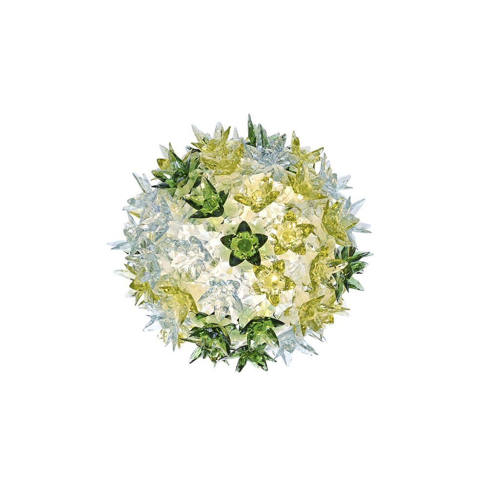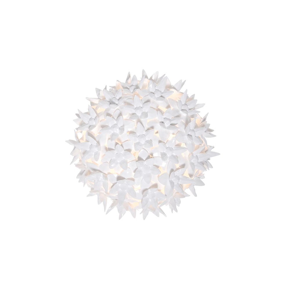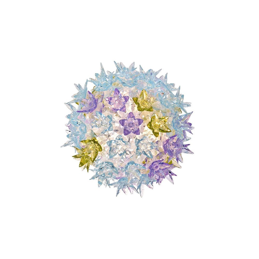 La familia de lámparas Bloom de forma elíptica, caracterizada por una original estructura recubierta de brillantes flores, puras y preciosas como el cristal, se compone de distintas medidas y de diversas funcionalidades: de suspensión, como aplique y de techo.