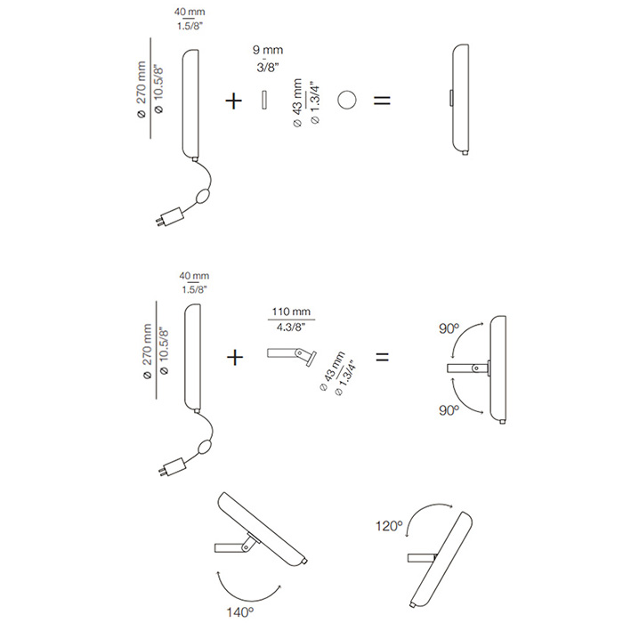 Aplique de pared con soporte fijo o movible. Dimensiones: Ø27x4h cm.