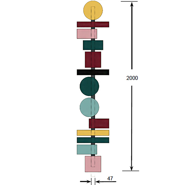 TOTEM 200: (3x circulo dorado, aguamrina y verde petróleo/4x rectángulo largo rojo púrpura, negro, dorado y verde petróleo/4x rectángulo rosa, verde petróleo, rojo púrpura y aguamrina/2x Cuadrado rojo púrpura y rosa)