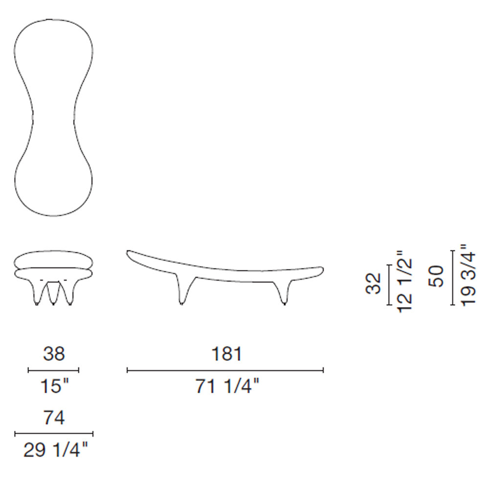 Banco en fibra de vidrio lacada pulido. Dimensiones 181x74x50h cm.