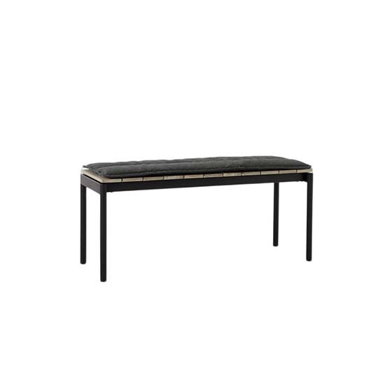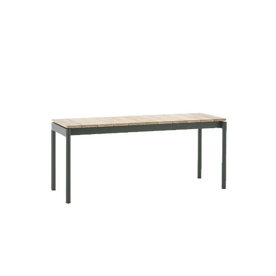 El banco Ville de Anderssen & Voll. En línea con sus mesas correspondientes, los bancos incluyen una superficie de listones de teca sobre el resistente marco de acero. Reforzando la estética distintiva de Ville, esta característica garantiza una temperatura confortable al primer contacto con los bancos. Lo que destacamos: Rico en materiales, se equilibra con la abundancia de la naturaleza, la teca envejecerá hermosamente con el tiempo, superficie suave para entornos de comedor.