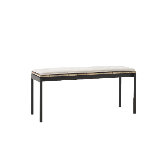 Banco con asiento de madera de teca sin tratar y estructura de acero.