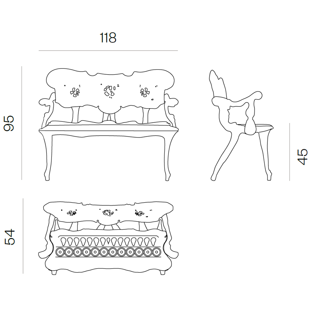 Hecho a mano, está configurado para dos o tres personas, con un asiento de roble sostenido por cuatro patas ahusadas. El marco fluido une el respaldo al asiento y se curva en reposabrazos ondulantes. Los tallados ornamentales de Gaudí incluyen tres motivos florales, creando una simetría que alinea las proporciones del sofá y resalta su ligereza y dimensiones esbeltas.
