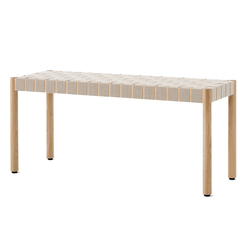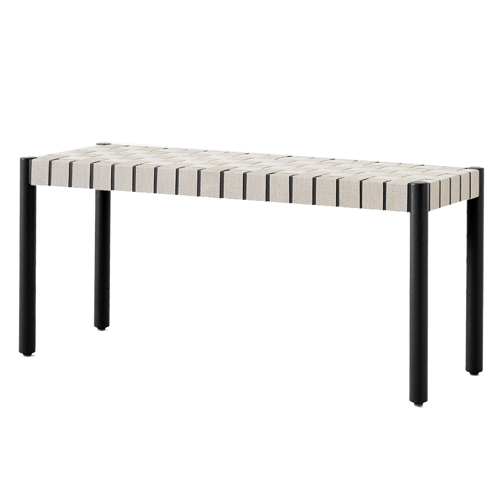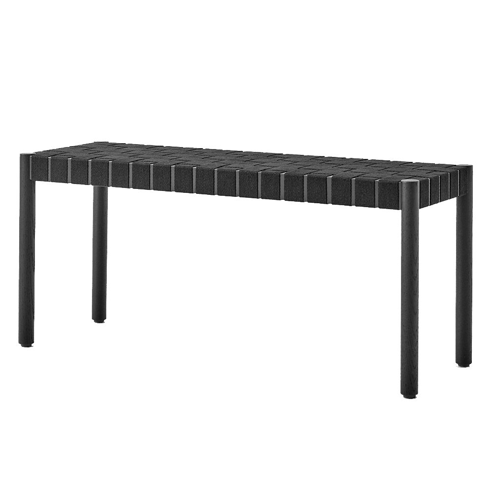 Banco de madera maciza lacada y asiento de correas de lino. Diseñada por Sami Kallio.