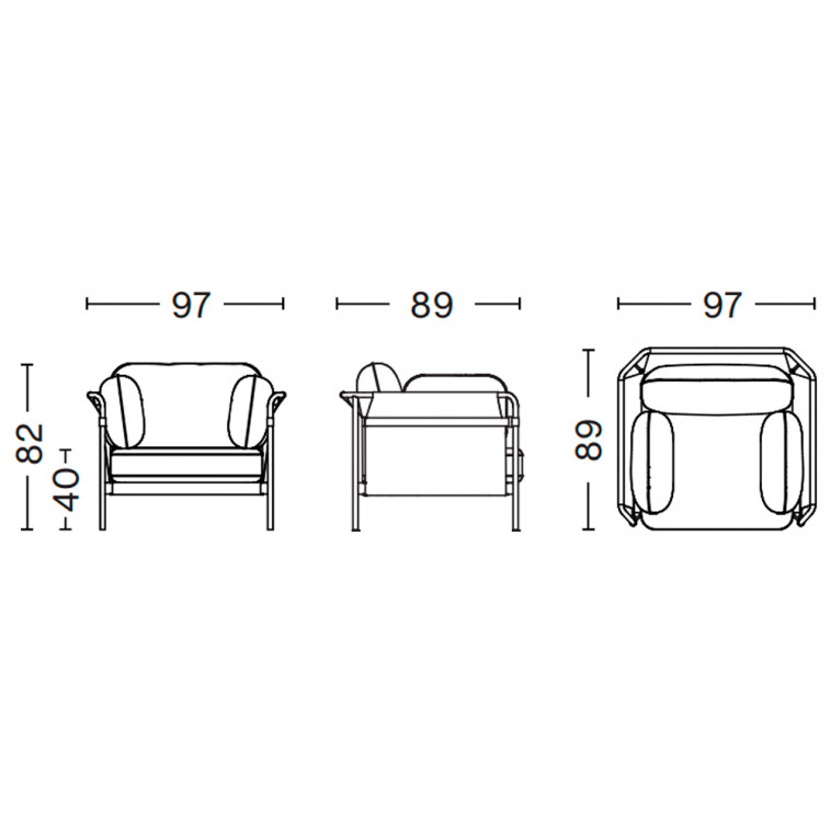 Butaca tapizada con cojines y estructura de acero. Dimensiones: 97x89x82h cm.