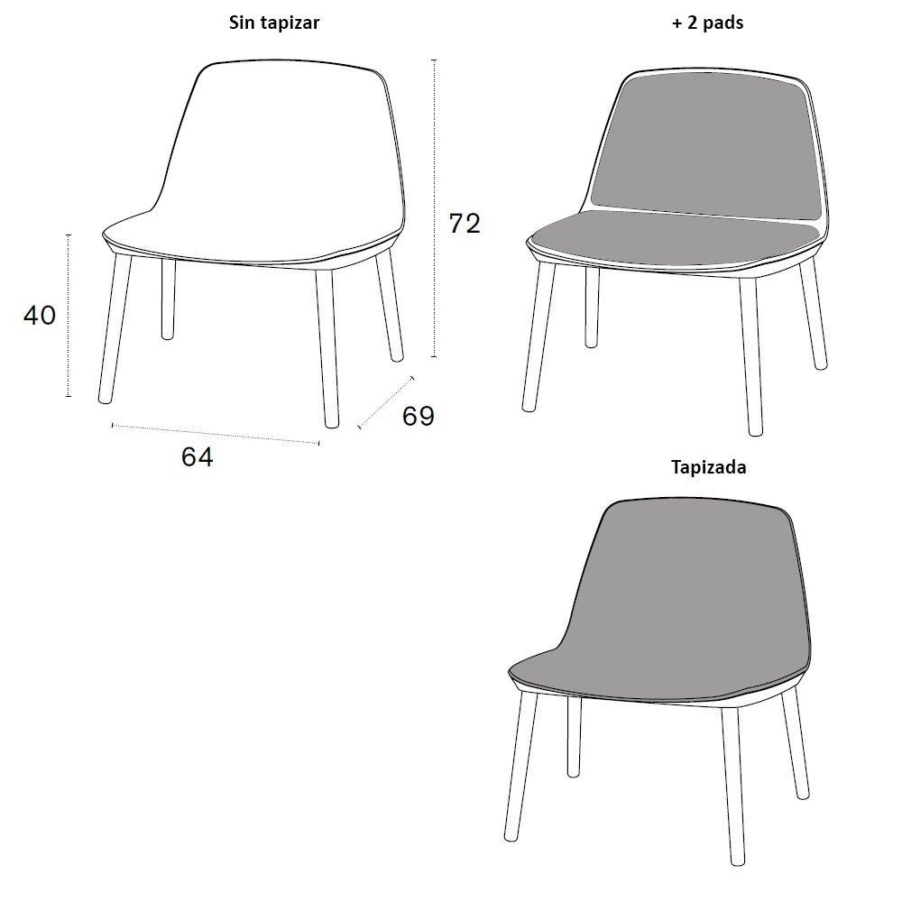 Butaca de madera con opción de almohadillas tapizadas. Dimensiones: 64x69x72h cm