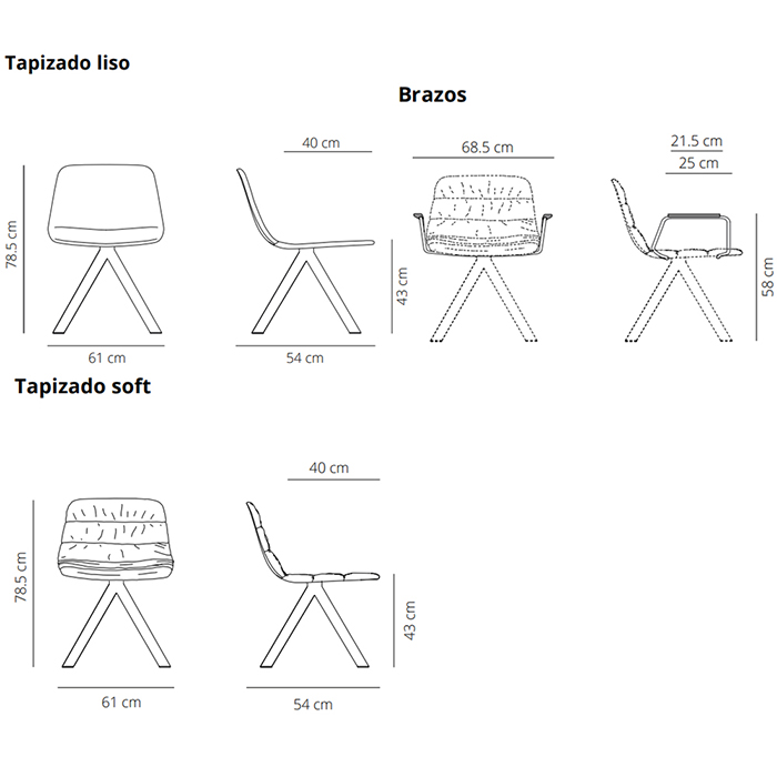 • Con brazos: De acero calibrado lacado en poliéster termoendurecido a juego con estructura, con reposabrazos de roble macizo pulimentado. Acabado: roble mate, cognac, ceniza, roble blanqueado o nogal