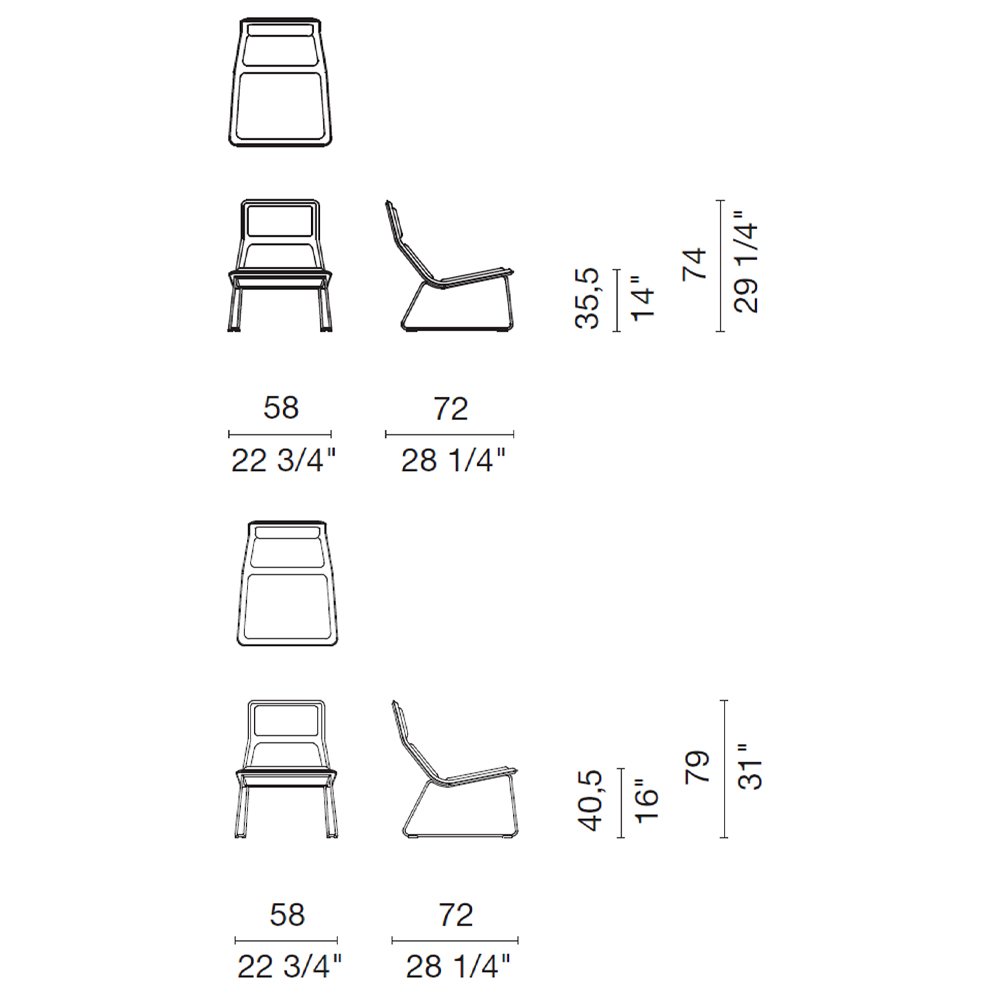 • Pies: polietileno gris sobre base de acero inoxidable satinado y lacado blanco polietileno negro sobre base lacada en negro y lodo.