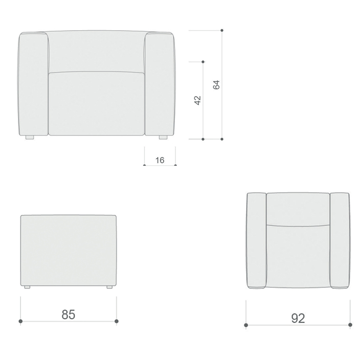 Butaca con brazos anchos acolchados. Dimensiones: 92x85x64h cm.