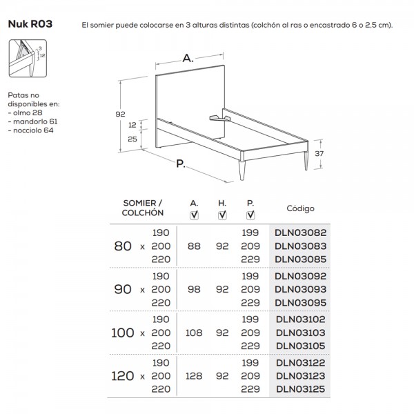 • El somier puede colocarse en 3 alturas distintas (colchón al ras o encastrado 6 o 2,5 cm).