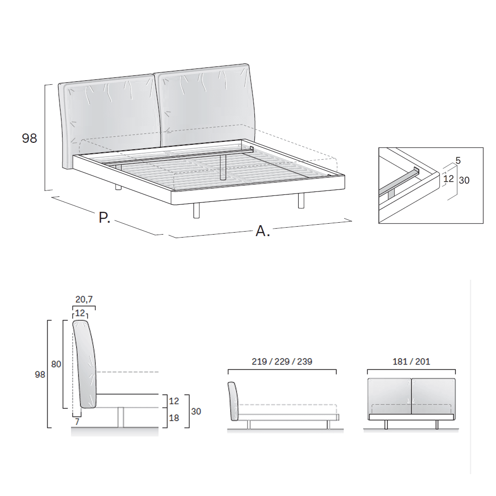 Las formas geométricas del aro de cama, con esquinas a 45° y patas cuadradas, crean una agradable combinación con la cabecera tapizada, formada por dos amplios cojines con elegantes y modernas costuras.