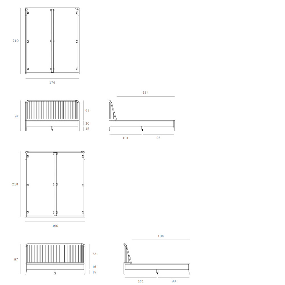 Cama de dos plazas con respaldo con líneas verticales de roble natural, teñido en negro o teca.