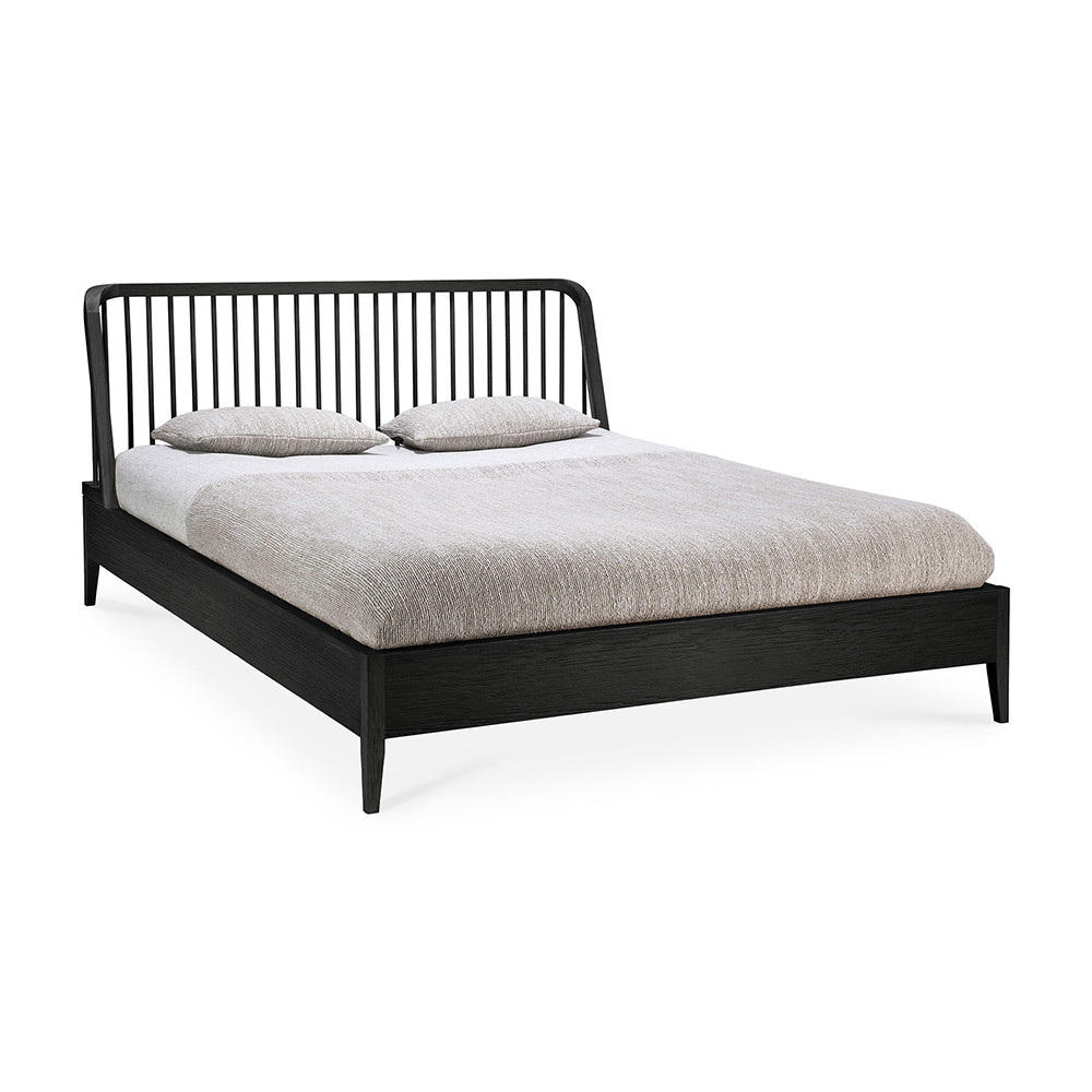 La cama innovadora Spindle de Ethnicraft toma su inspiración en la tradicional rueca e incorpora en su forma radios verticales perfectamente alineados en el cabecero.