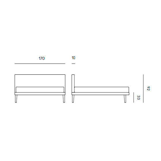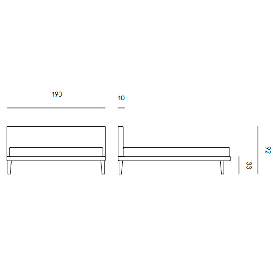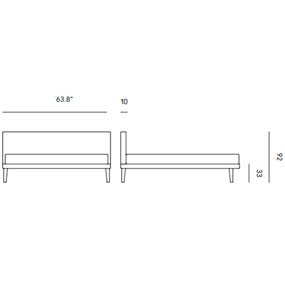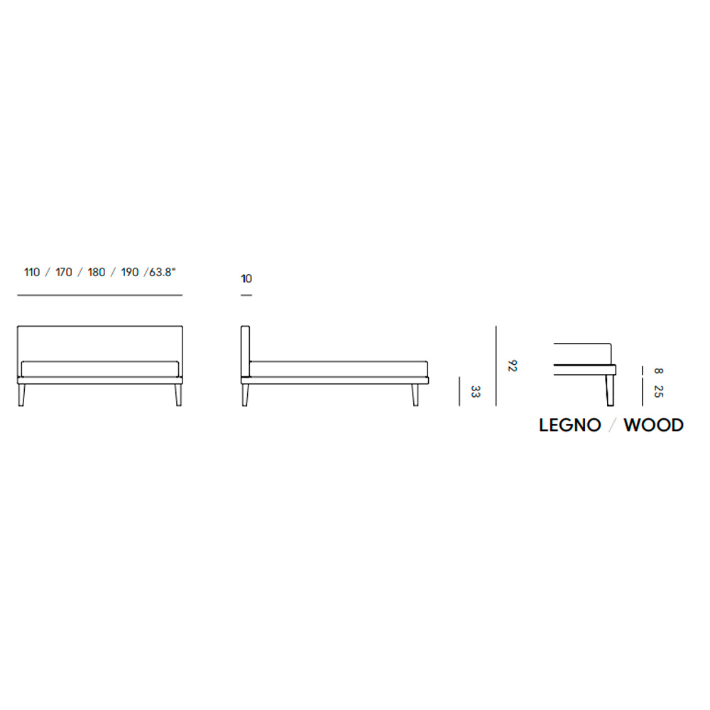 Cama con cabecero tapizado y patas de madera. Diseño de Orizzonti Design Center.