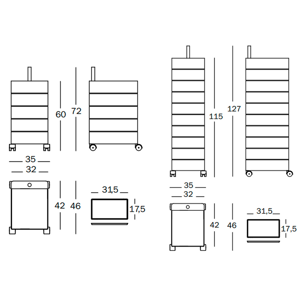 El contenedor está disponible en dos modelos: de cinco o diez cajones soportado sobre ruedas.