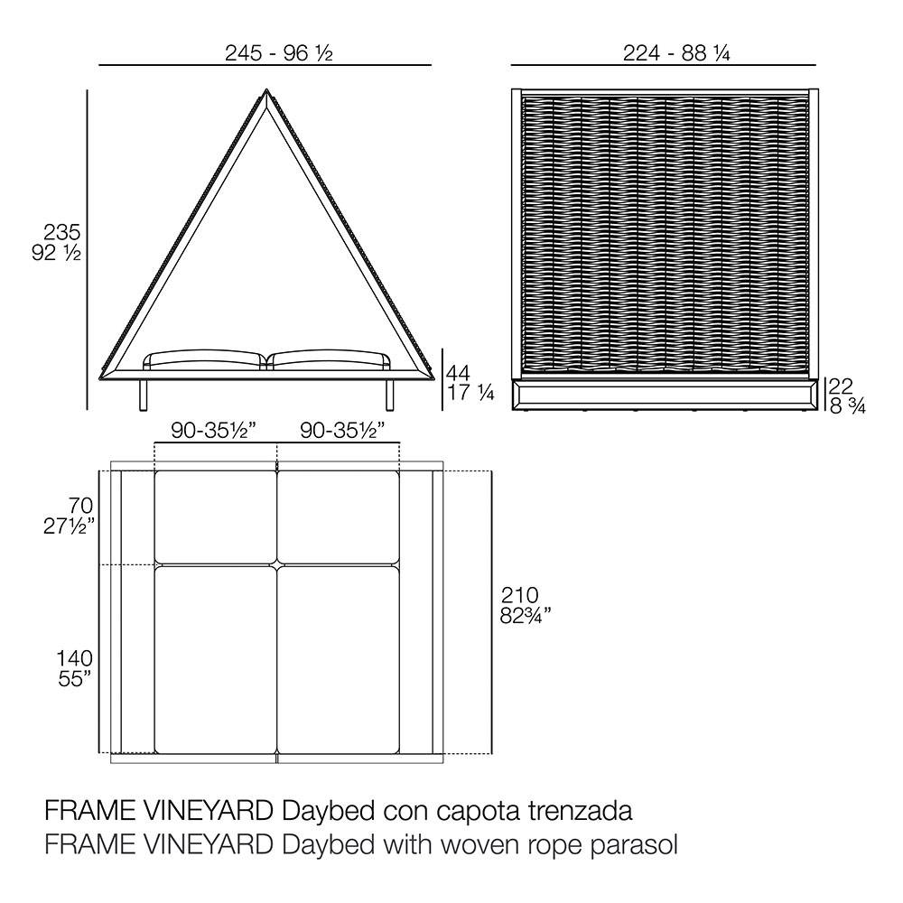 Cama con techado con forma de cabaña para exterior, tapizado Sunvision y colchonetas tapizadas. Con reminiscencias a la arquitectura tradicional por su tejado a dos aguas, la pieza se compone de una estructura de aluminio y un colchón doble reclinable que incrementa la comodidad y versatilidad de esta daybed. Sus líneas puras y simples y su forma piramidal hacen de ella el escenario ideal para descansar, hablar, meditar, dormir o simplemente relajarse.