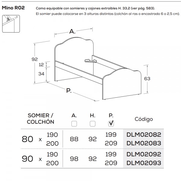 • El somier puede colocarse en 3 alturas distintas (colchón al ras o encastrado 6 o 2,5 cm).
