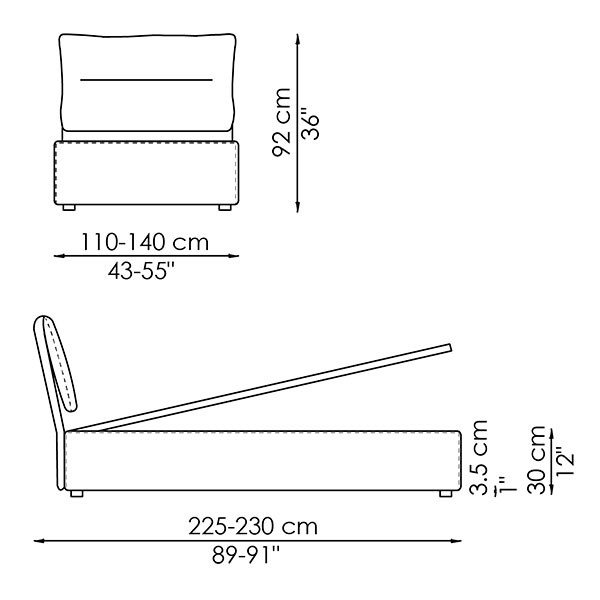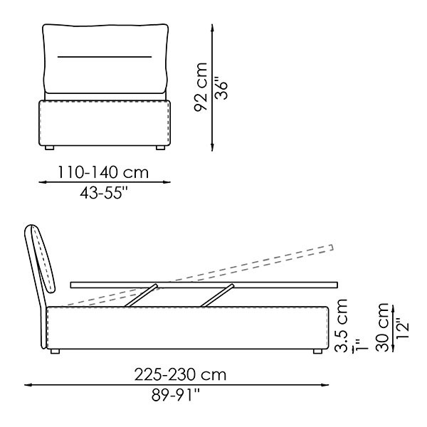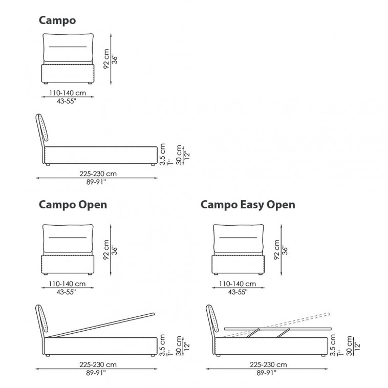 La variante Campo easy open está equipada no solo con el conveniente contenedor sino también con un mecanismo de doble movimiento que permite que la parte superior se eleve por completo para facilitar el arreglo y la limpieza de la cama.