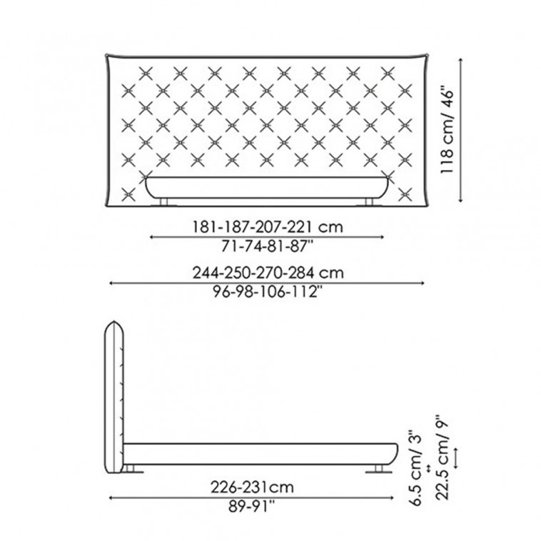 Full Moon es una cama doble con una cabecera opulenta que, gracias a su refinado acolchado capitoné, enmarca la cama y otorga una sensación de abundancia y suavidad, reiterada por el marco de la cama drapeado. Otro detalle distintivo son las patas de metal pintado, de forma circular, disponibles en una serie de variaciones de color.