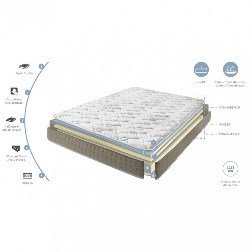 Colchón acolchado con viscoelástica, núcleo de hr de alta densidad y laterales con tejido 3D. Acolchado especial firmeza, elegante, transpirable y con tratamiento antiácaros para una perfecta higiene y un entorno libre de reacciones alérgicas. Colchón con todas las ventajas de la viscoelástica.
