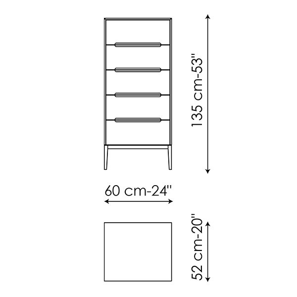 Cómoda o Sinfonier en estructura de madera con 4 patas de metal. Diseño Mario Mazzer.