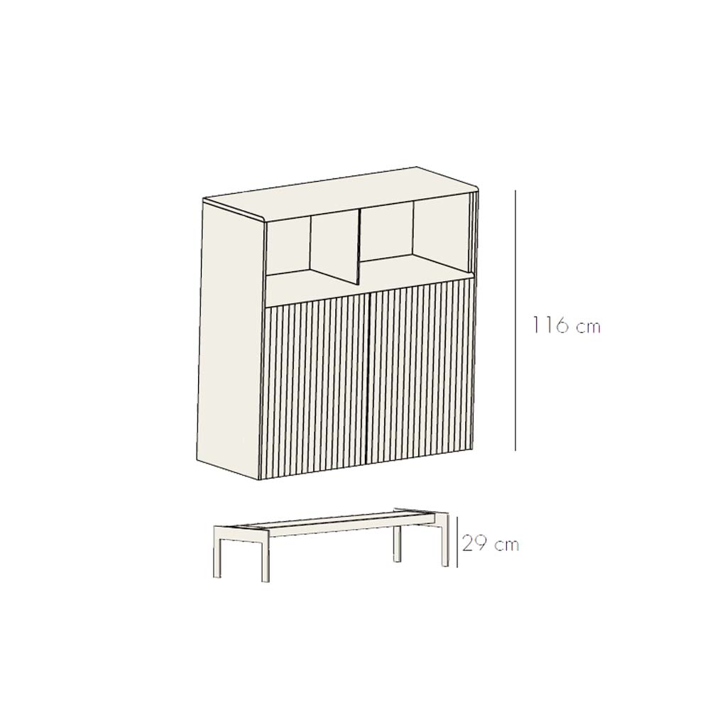 Esta cómoda de diseño está fabricada en madera con unas suaves curvas que cobran protagonismo escénico. Este modelo se compone de 2 puertas abatibles ranuradas y un diáfano interior.