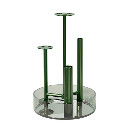 Las flautas de metal y vidrio verde sostienen flores individuales gracias a esto se puede tener una apreciacion completa de cada flor con la que se adorne desde todos los ángulos que pueda imaginar. Ademas el agua que se deposita en la bandeja de vidrio que se encuentra debajo mantiene los arreglos frescos y por mucho mas tiempo.