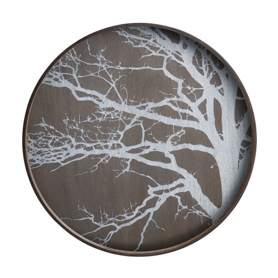 Bandeja redonda de madera serigrafiada con forma de árbol. Dimensiones: Ø61x4h cm