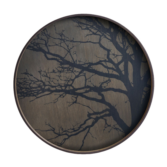 Esta bandeja de madera White o Black Tree experimenta con el equilibrio entre patrones ricos compensados con tonos apagados, revelando la belleza detrás de los temas engañosamente ordinarios de los que se inspira.