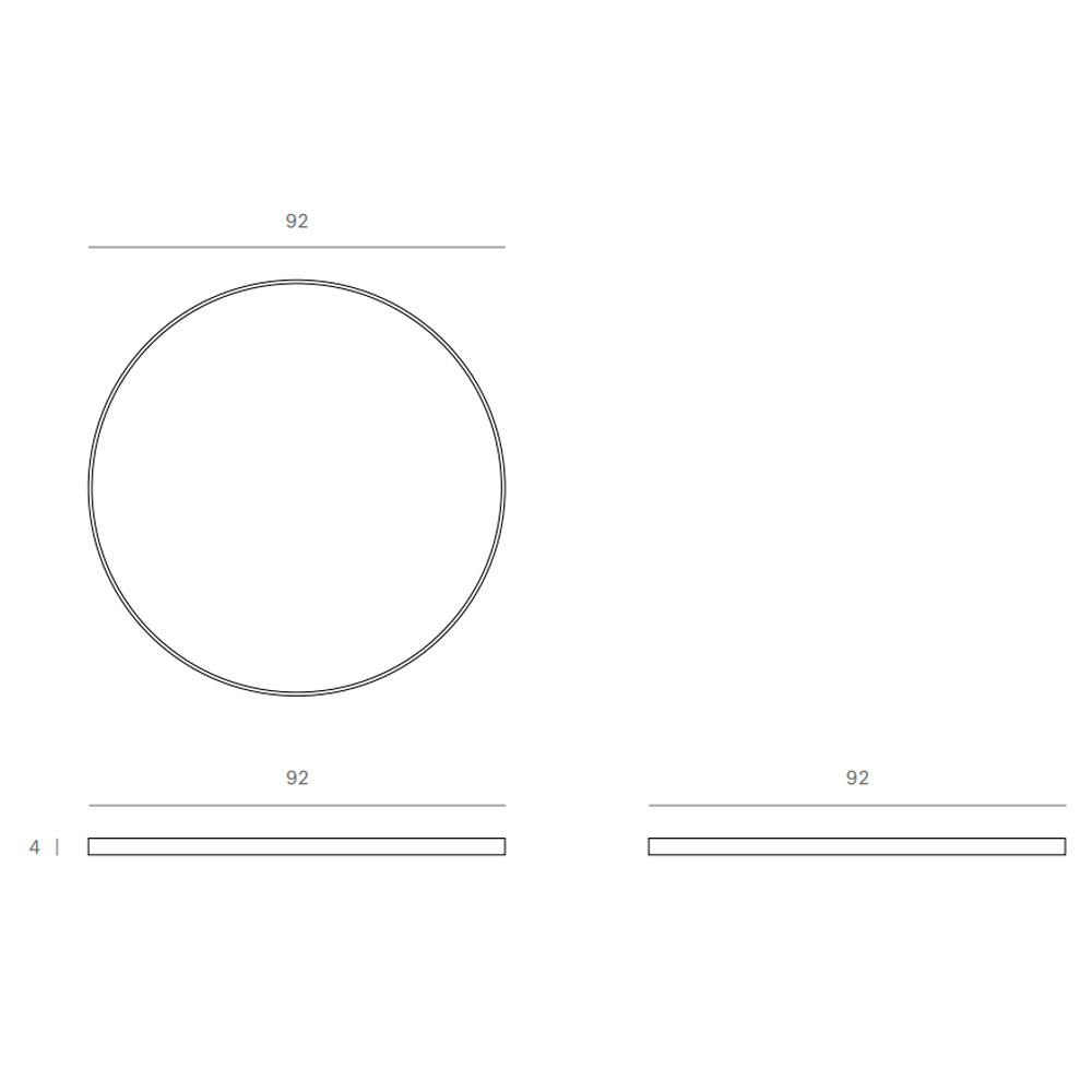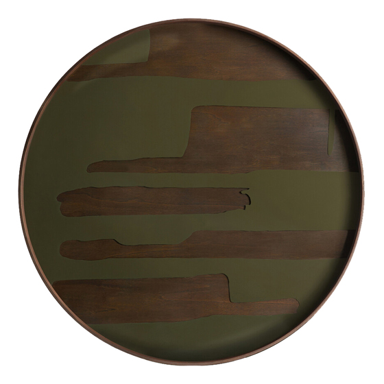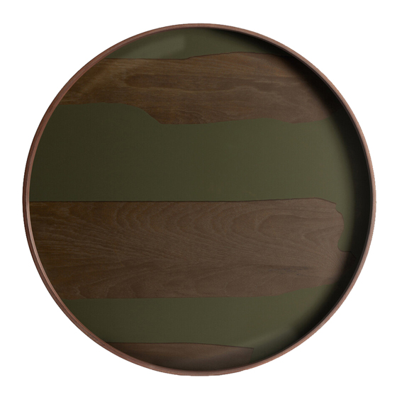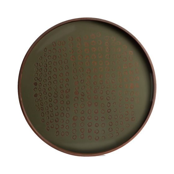 Bandeja redonda de vidrio serigrafiado con borde chapado en marrón teca. Diseño por Dawn Sweitzer.