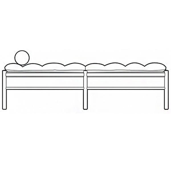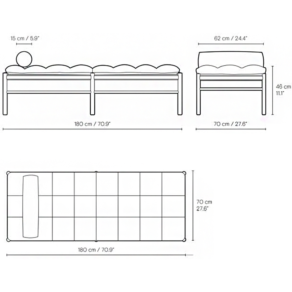 Está tapizado en piel y tiene un cojín largo que parece flotar sobre una estructura de roble macizo. La almohada del asiento está sostenida por una delgada pero fuerte banda de algodón de color natural.