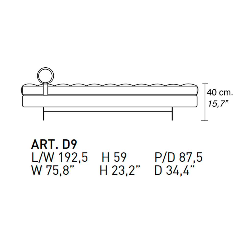 Daybed con base de aluminio y tapizado en piel. Dimensiones: 192,5x87,5x59h cm.