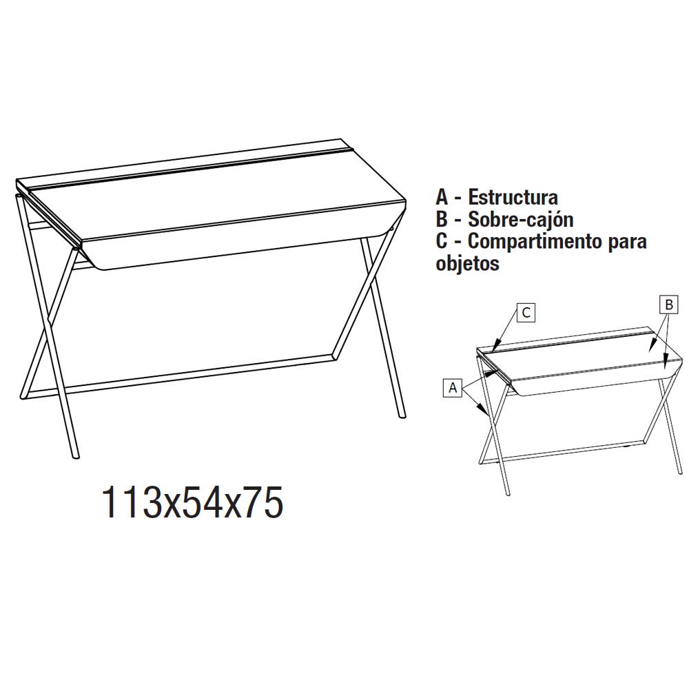 Escritorio con estructura en acero lacado y sobre y cajón en madera. Dimensiones: 113x54x75h cm.