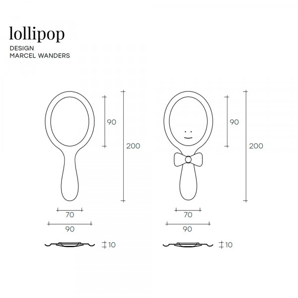 Lollipop está disponible en dos modelos: espejo moldeado y espejo moldeado con accesorios, que incluye una carita sonriente en el espejo y un detalle de un lazo.