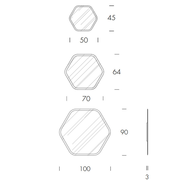 Un tríptico de espejos hexagonales, con bordes biselados en plata, bronce o fumé.