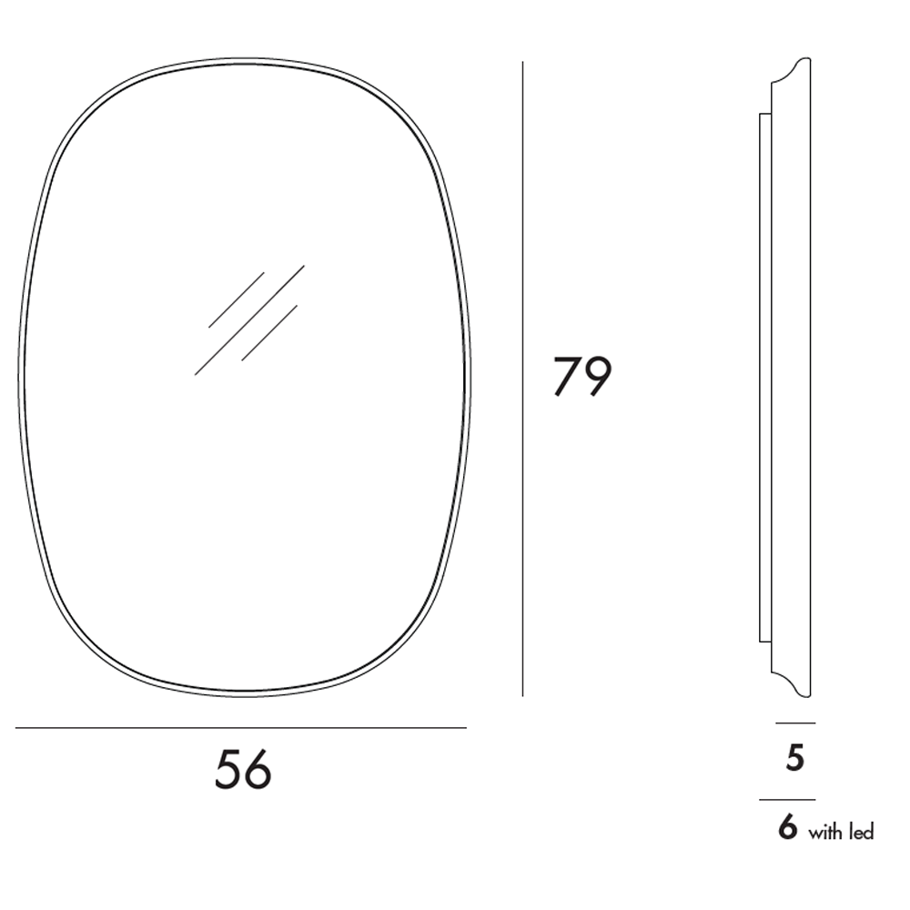 El espejo Slen de Sovet Italia es un diseño ovalado con marco de MDF lacado, disponible en acabados café, negro, arcilla o maggese. El espejo central está disponible en varias tonalidades: extra claro, ahumado o bronce.