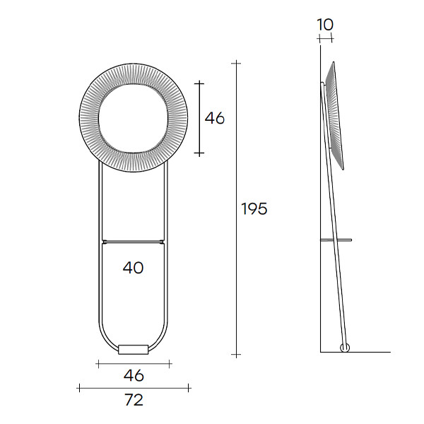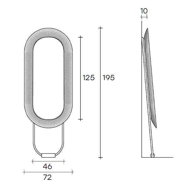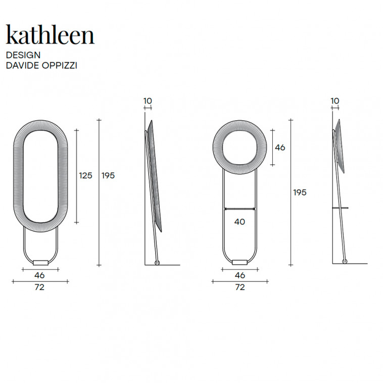 El espejo plano tiene 5 mm de espesor y está enmarcado en vidrio fundido de 6 mm, con un acabado retro-barnizado. En la versión de pie su estructura está realizada en metál en acabado Champagne Metalizado o Gris Volcán, y con un pie de madera en la parte inferior.